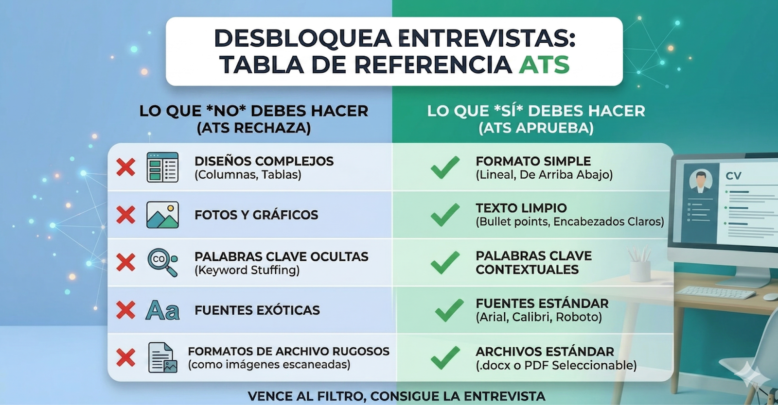 • Sin gráficos ni tablas: El ATS suele ignorar el contenido dentro de tablas o cajas de texto.