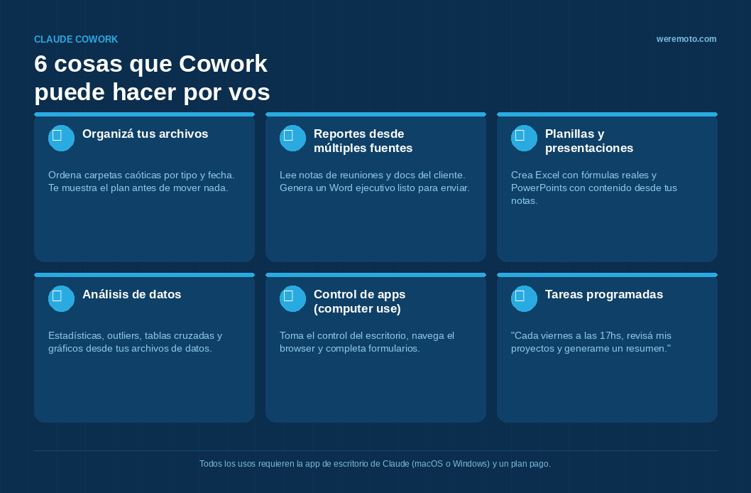 Pero si manejás múltiples clientes, generás reportes frecuentes o perdés tiempo recurrente en consolidación, Cowork puede tener un impacto directo. Los datos son consistentes: quienes más se benefician son quienes tienen alto volumen de tareas repetitivas de mediano valor.