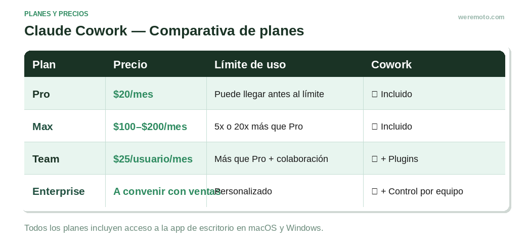 Tres cosas: la app de escritorio de Claude instalada en macOS o Windows, un plan pago, y la computadora encendida con la app abierta mientras Cowork trabaja. Si cerrás la app, la tarea se detiene.