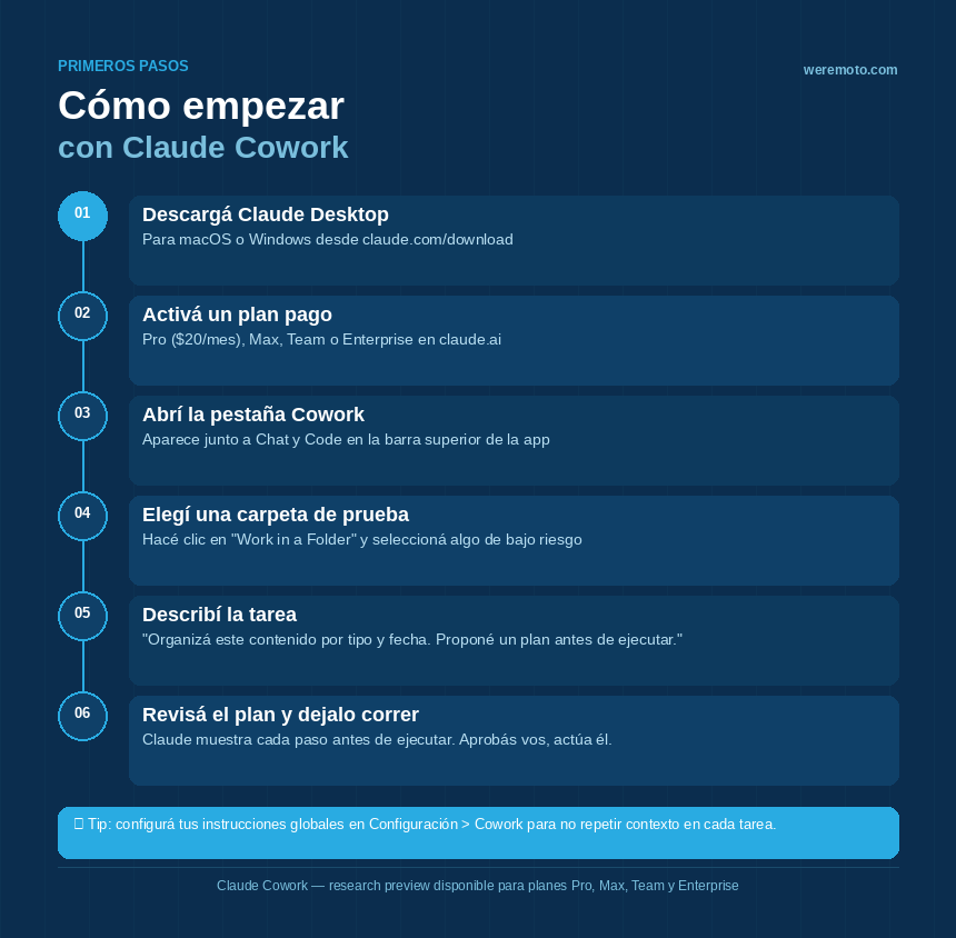 Si nunca usaste Cowork, el mejor primer paso es una tarea concreta y de bajo riesgo: pedirle que organice una carpeta de archivos no críticos. Así entendés el flujo — cómo muestra el plan, cómo podés intervenir, cómo entrega el resultado — sin que nada importante esté en juego.