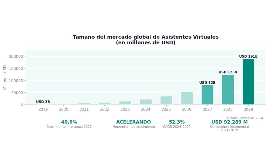 Se prevé que el tamaño del mercado de asistentes virtuales aumente en USD 92,29 mil millones, a una CAGR del 52,3 % entre 2024 y 2029.